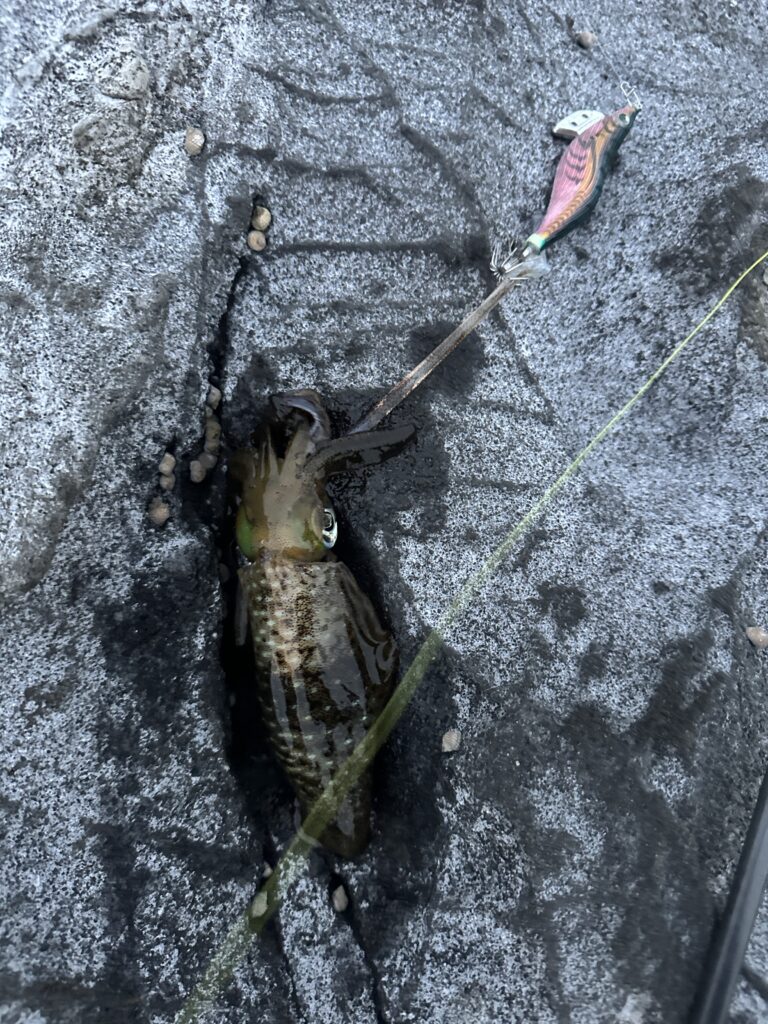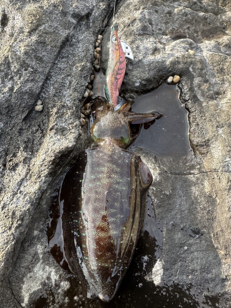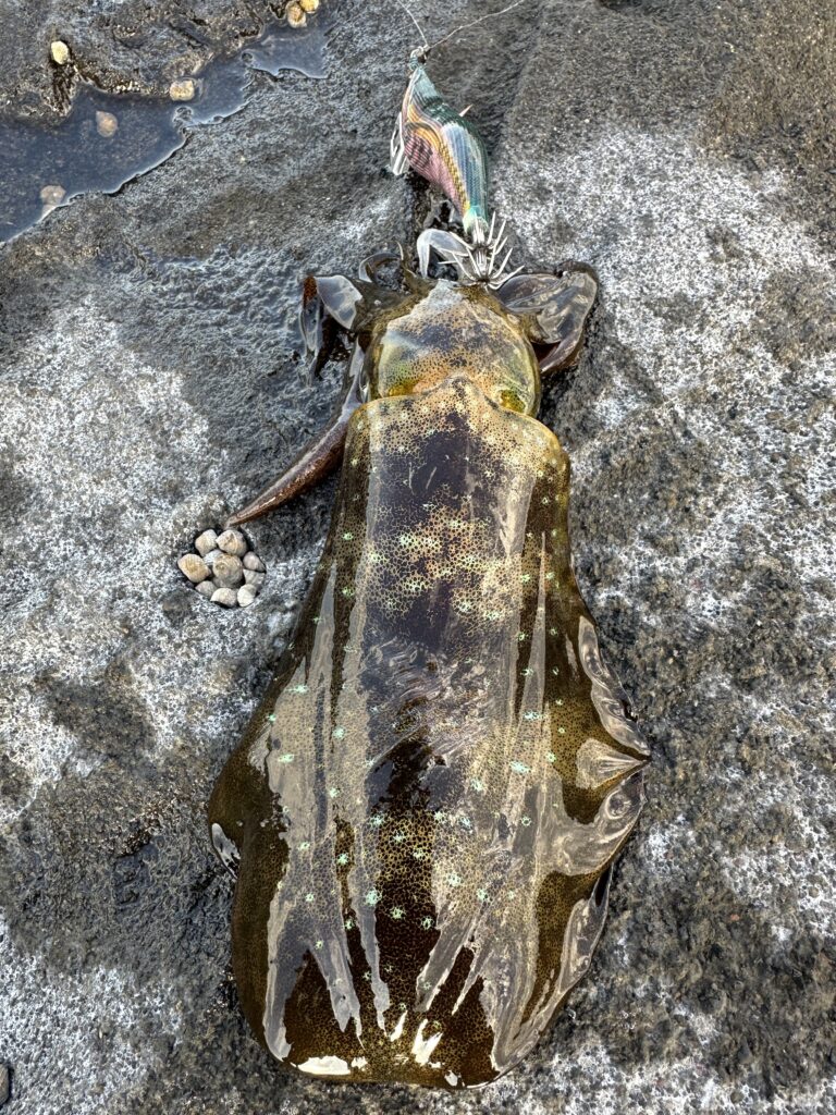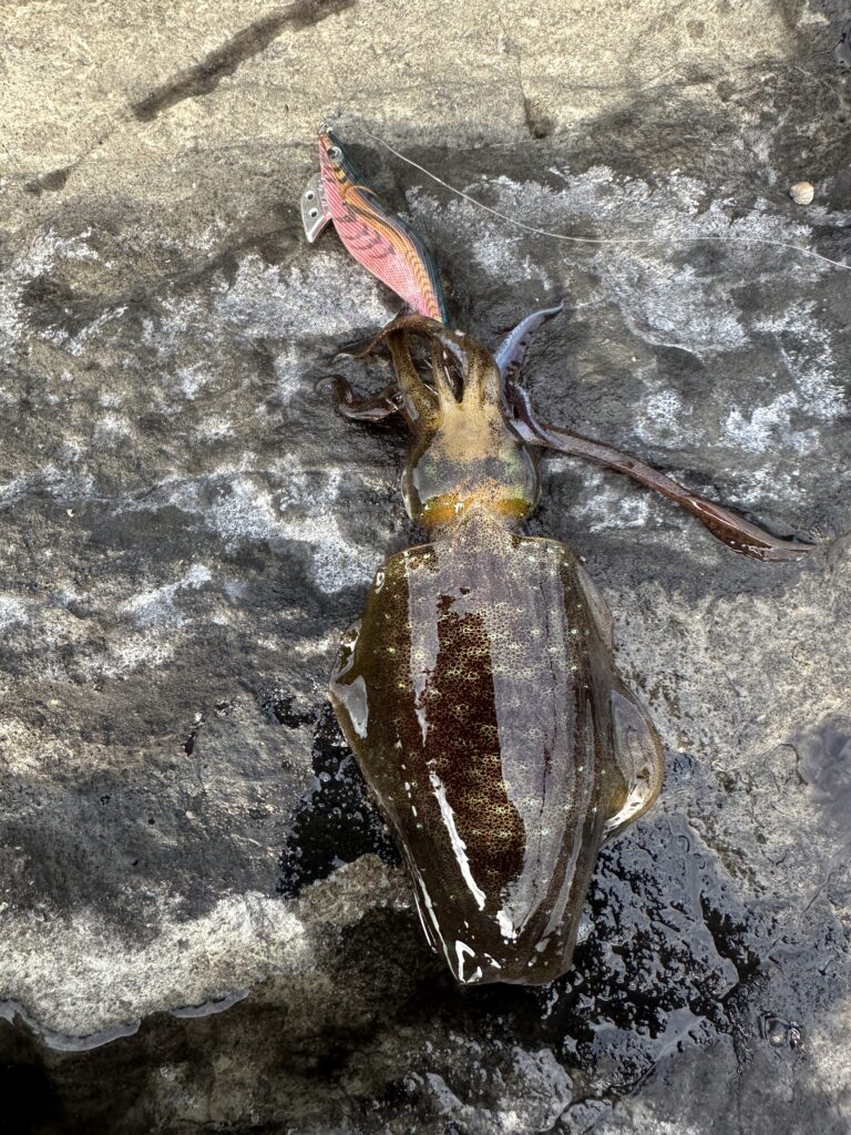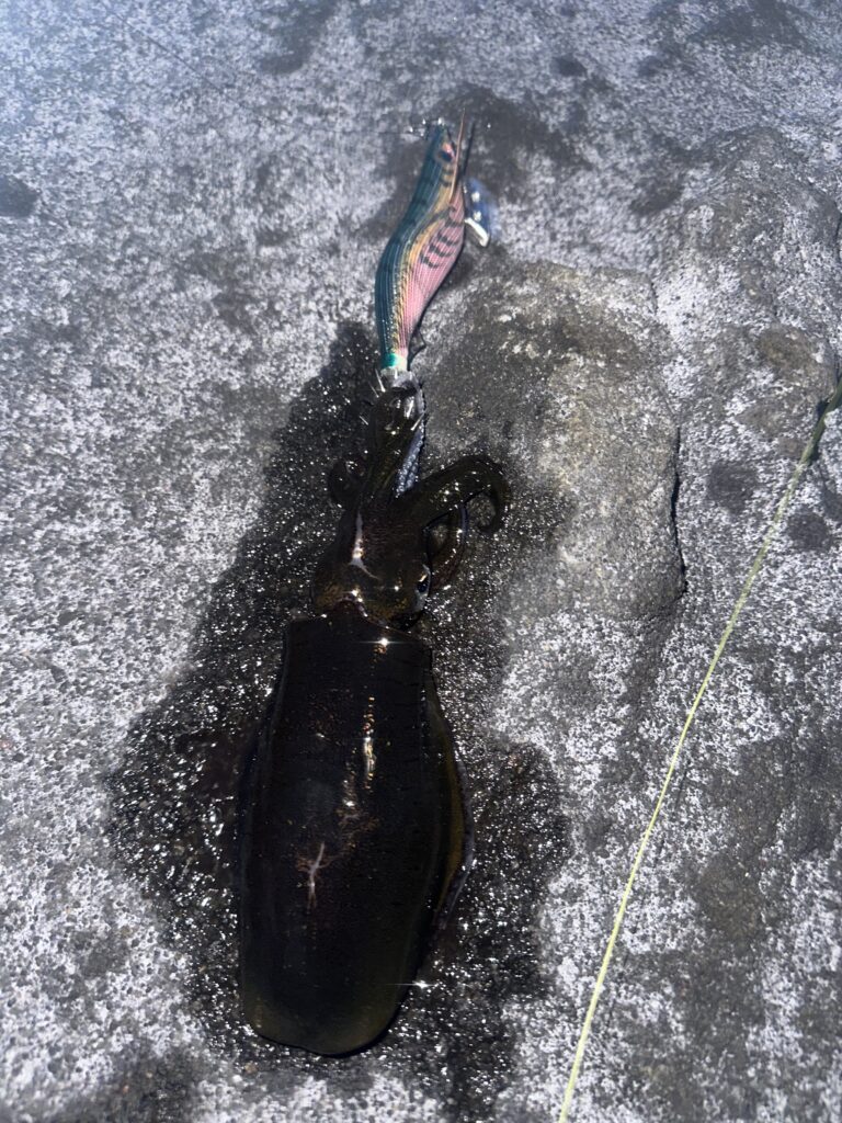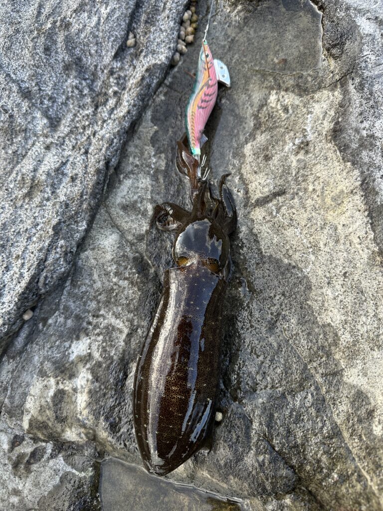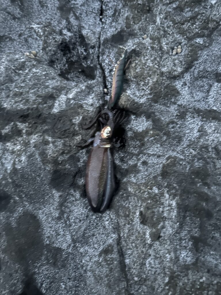 一応、気休めにイカ墨ついてるか確認するも、こんな所でエギングやる人いないので、墨後あるわけない、、