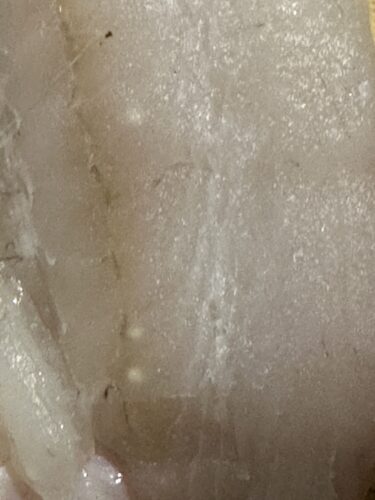 ヒラスズキを捌く際、以下のポイントで白色のシスト(袋状の構造)がないか確認すべし: