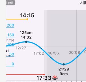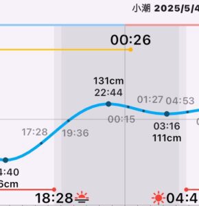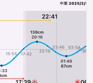小潮の満潮前後はこれも同じ理由で日没から、数時間で満潮を迎えるので、経験があり、このケースも得意。