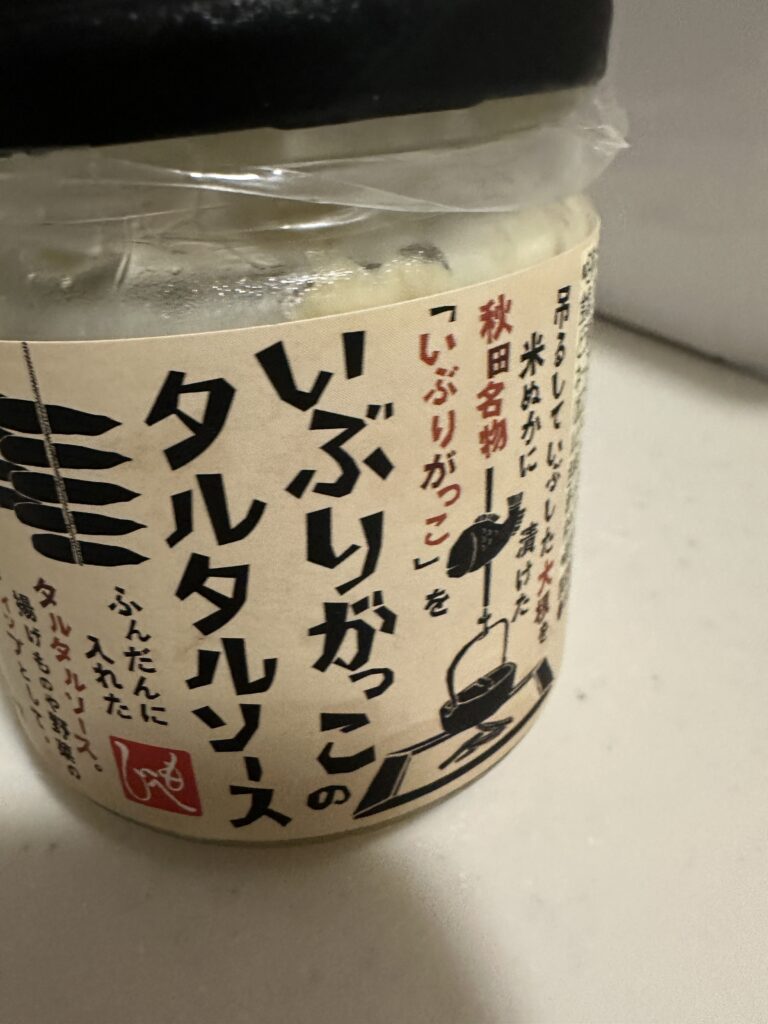 秋田の伝統漬物「いぶりがっこ」を使ったタルタルソース。燻製の香りと歯ごたえがタルタルソースに溶け込んで、ヒラスズキフライにつけると和洋折衷の贅沢な一品に。いぶりがっこの風味がクセになる美味さ。