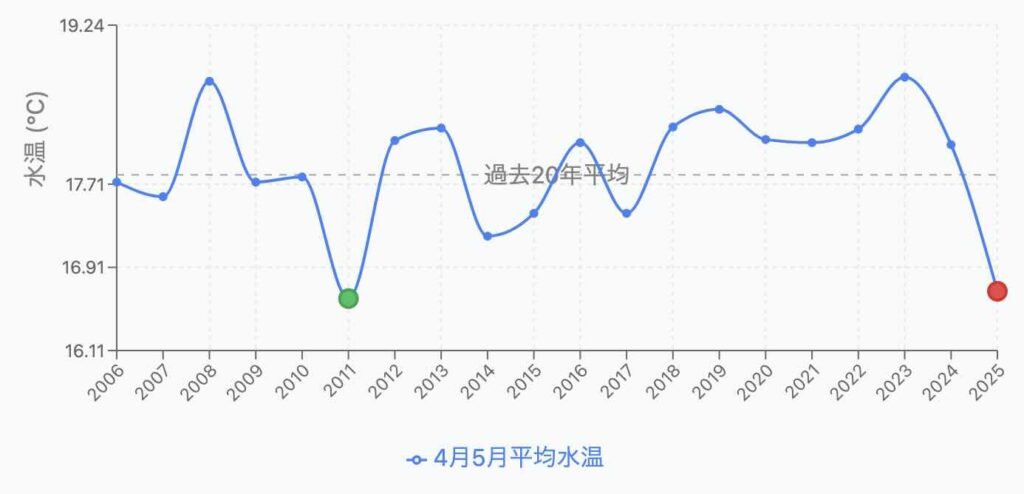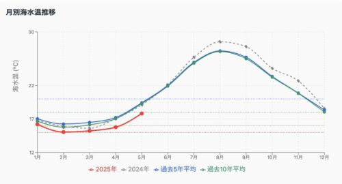 ここグラフから見ると2025年の海水温は通常より1ヶ月遅れて温かくなっているので、シンプルに6月から本番と捉えて良さそう。